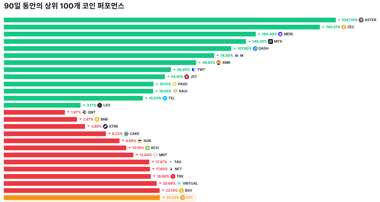 비트코인은 전일 대비 0.62% 하락한 8만6507달러에 거래됐다. 90일 누적 수익률은 -22.22%로, 지난주 -21.25%에서 더 악화했다.