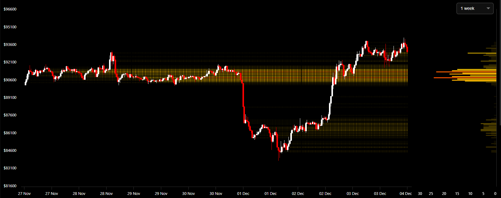 VPVR 분석에서도 이러한 가격 구조가 동일하게 확인된다. 24시간 기준으로는 92,000달러 초반에 가장 두터운 매물대가 형성돼 지지·저항이 교차하는 균형축을 이루고 있으며, 일주일 기준으로는 상단 매도대가 여전히 가격 상승을 제한하는 장벽으로 나타난다. 현재 가격이 93,426달러 수준에 위치한 점을 고려하면 단기적으로 상단보다 하단 지지대와의 거리가 더 가깝기 때문에 조정과 반등이 섞인 미세 변동 구간이 이어질 가능성이 크다.