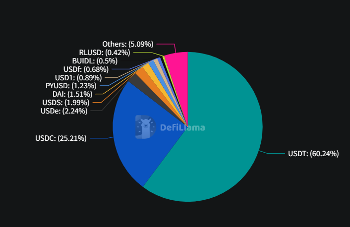 이어 USDe는 2.24%, 스카이달러는 1.99%, 다이는 1.51%, 페이팔 USD는 1.23%, USDf는 0.68% 비중을 기록했다.