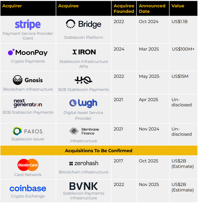 실제로 테더(Tether)와 서클(Circle)은 각각 플라즈마(Plasma)와 아크(Arc)라는 자체 결제 네트워크를 구축하며 영향력을 확대하고 있다. 전통 핀테크 기업의 공세도 거세다. 스트라이프(Stripe)는 11억 달러(약 1조 5천억 원)에 스테이블코인 인프라 기업 브리지(Bridge)를 인수하며 시장 선점에 나섰고 , 코인베이스 역시 결제 인프라 확장을 위해 BVNK를 약 20억 달러 규모에 인수 추진하는 등 전통 금융과 암호화폐 기업 간의 경계가 무너지고 있다. 이는 단순한 서비스 확장이 아니라 차세대 비자(Visa)와 국제은행간통신협회(SWIFT), 그리고 머니마켓펀드(MMF)의 기능을 통합한 거대 금융 플랫폼이 되기 위한 패권 다툼으로 해석된다.
