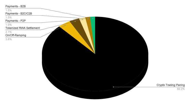 과거 스테이블코인은 주로 암호화폐 투자를 위한 예치금 성격이 강했으나, 현재는 그 용도가 근본적으로 변화했다. 바이낸스 리서치 조슈아 웡(Joshua Wong) 연구원의 분석에 따르면 바이낸스 월간 활성 사용자 중 단 12%만이 트레이딩에 집중하고 있으며 , 나머지 88%는 결제(Pay), 환전(Convert), 이자 수익(Earn) 등 비투기적 유틸리티 목적으로 플랫폼을 이용하고 있는 것으로 확인됐다. 이는 스테이블코인의 효용성이 투기적 수요를 압도하기 시작했음을 보여주는 결정적인 지표로, 단순한 투자 자산에서 디지털 경제의 필수 통화로 진화했음을 의미한다.