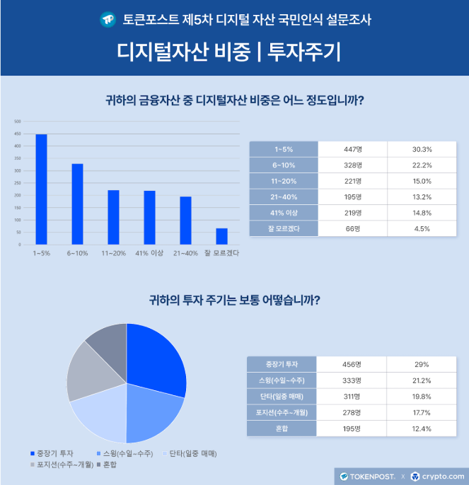 토큰포스트는 한국 디지털자산 시장 참여자들의 인식과 투자 행태를 파악하기 위해 ‘제5차 디지털자산 국민 인식 조사’를 진행했다. 이번 조사는 글로벌 거래소 크립토닷컴(Crypto.com)과 공동으로 수행됐으며, 디지털자산 투자자·관심층·비투자자를 포함한 총 1,812명이 온라인 설문에 참여했다. 급변하는 규제 환경과 ETF·스테이블코인·RWA·AI 등 새로운 산업 흐름 속에서 한국 이용자들이 실제로 무엇을 경험하고 어떻게 인식하고 있는지를 데이터로 기록하는 데 목적이 있다.