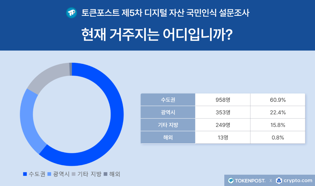 거주지는 수도권이 958명(60.9%)으로 과반을 차지했고, 광역시 353명(22.4%), 기타 지방 249명(15.8%) 순이었다. 해외 거주 응답자는 13명(0.8%)에 그쳤다.
