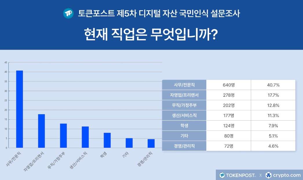 직업별로는 사무·전문직이 640명(40.7%)으로 가장 높은 비중을 보였으며, 자영업·프리랜서 278명(17.7%), 무직·가정주부 202명(12.8%), 생산·서비스직 177명(11.3%), 학생 124명(7.9%) 순이었다.