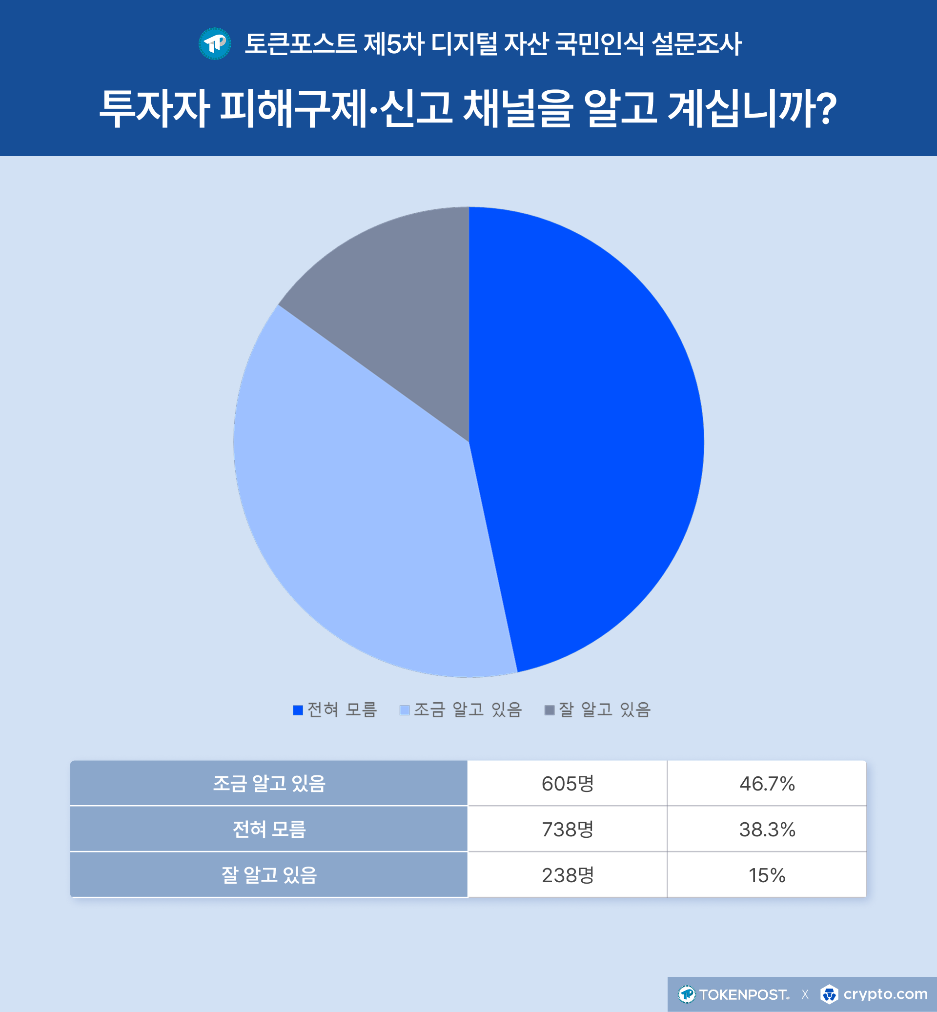 투자자 피해구제·신고 채널 인지도 조사에서는 ‘전혀 모름’이 738명으로 가장 많았고, ‘조금 알고 있음’ 605명, ‘잘 알고 있음’ 238명 순으로 나타났다.