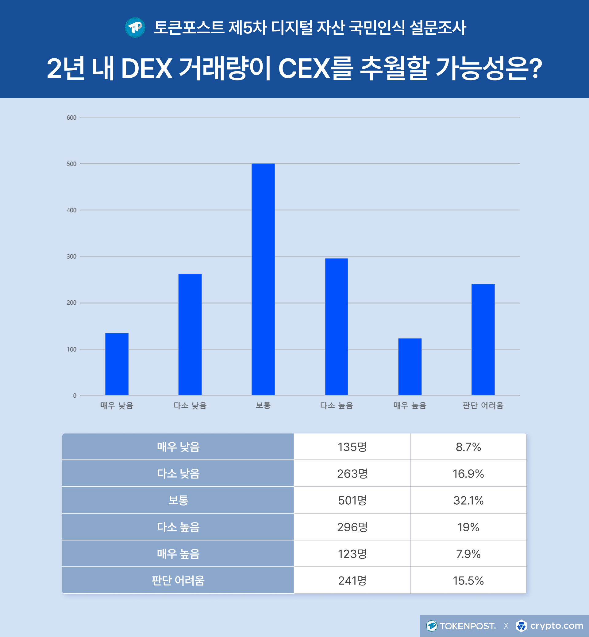 2년 내 DEX 거래량이 중앙화 거래소(CEX)를 추월할 가능성 역시 ‘보통’이 32.1%로 최다였으며, 긍정 응답과 부정 응답이 함께 분포했다. ‘판단 어려움’ 응답도 15.5%로 집계돼, 확산 전망에 대해 유보적 태도가 적지 않은 것으로 나타났다.