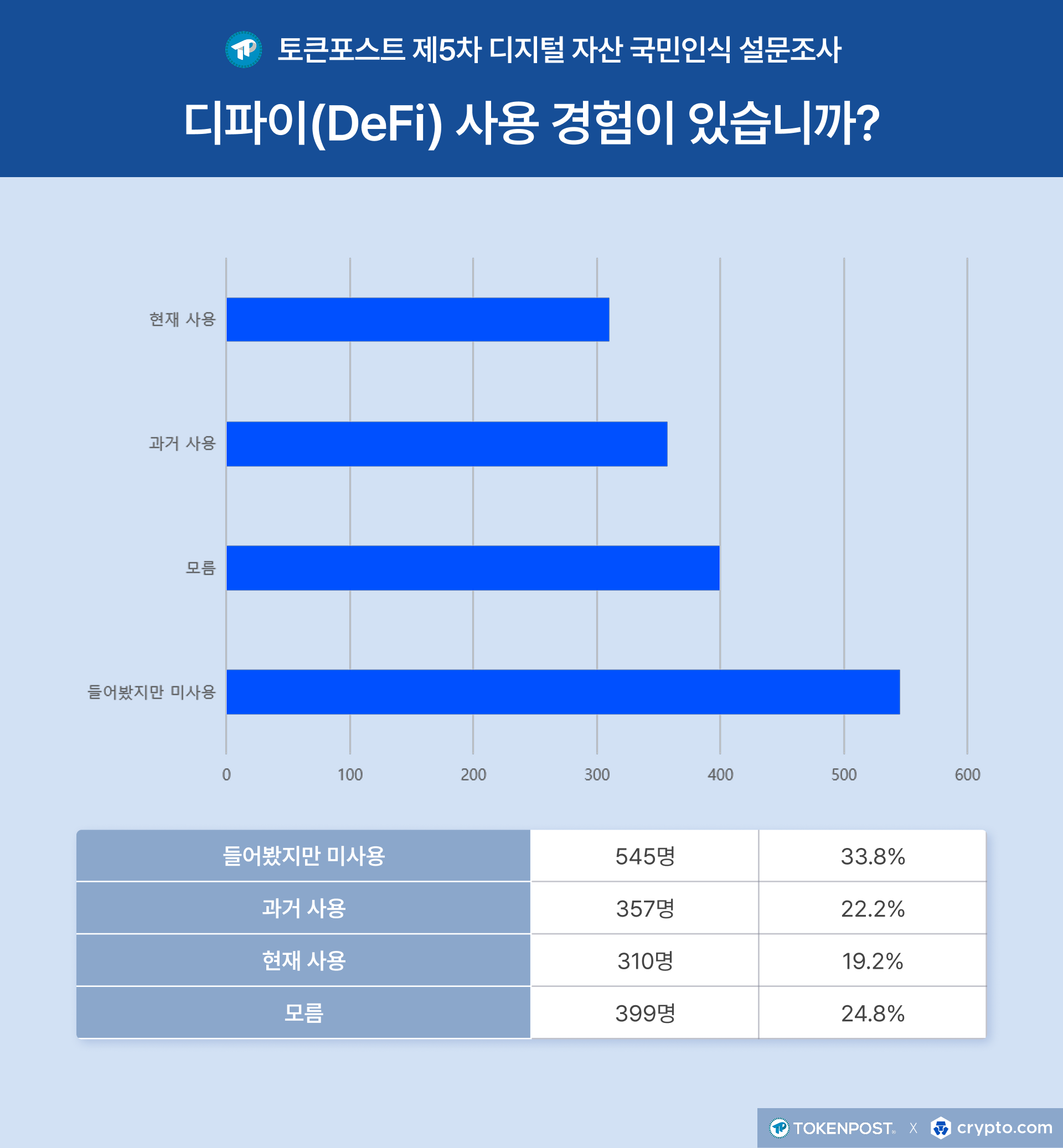 디파이 사용 경험은 ‘들어봤지만 미사용’이 33.8%로 가장 많았고, ‘현재 사용’과 ‘과거 사용’을 합한 ‘사용 경험 있음’은 41.4%로 나타났다. 반면 ‘모름’ 응답도 24.8%로 집계돼, 인지도와 실제 경험이 함께 혼재된 양상을 보였다.