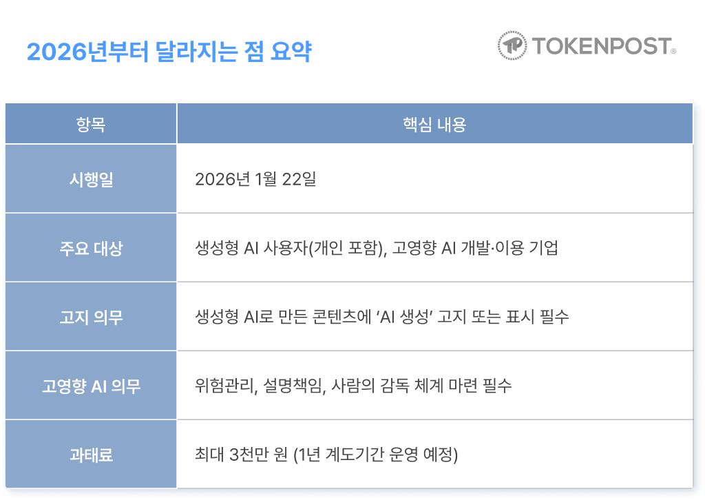 2026년 1월 22일부터 대한민국에서 인공지능(AI) 활용에 대한 첫 포괄적 법률이 시행된다. 「인공지능 발전과 신뢰 기반 조성 등에 관한 기본법(약칭: 인공지능기본법)」은 AI 기술의 발전을 촉진하는 동시에, 국민의 기본권과 신뢰를 보호하기 위한 법적 장치를 마련한 것이다.