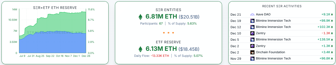 전략자산(SER) 보유 물량은 681만 ETH(약 205억1000만 달러)로, 전체 이더리움 공급량의 5.63%를 차지했다.