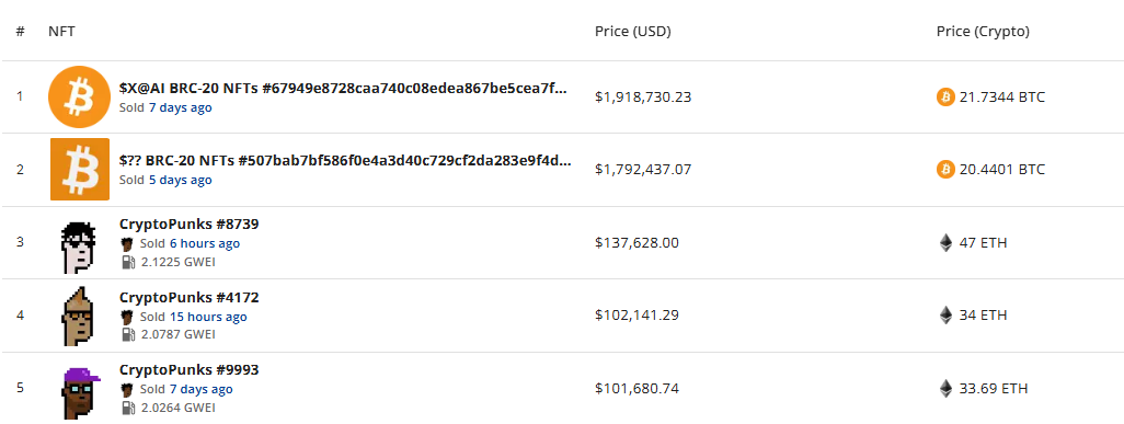 이어 ▲$?? BRC-20 NFTs #507bab7bf586f0e4a3d40c729cf2da283e9f4d…(179만2437달러, 20.4401 BTC) ▲크립토펑크 #8739(13만7628달러, 47 ETH) ▲크립토펑크 #4172(10만2141달러, 34 ETH) ▲크립토펑크 #9993(10만1680달러, 33.69 ETH)이 뒤를 이었다.