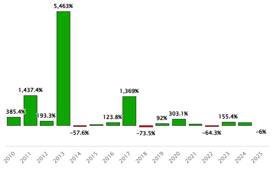 스탯뮤즈에 따르면 비트코인의 연초 대비 수익률은 -6%로, 이달 초 -3.2%에서 더 악화했다. 최근 3년간 연간 수익률은 ▲2022년 -64.3% ▲2023년 155.4% ▲2024년 121%이다.