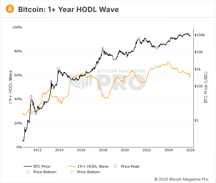 1+ Year HODL 웨이브는 59.38%로, 전주(59.12%) 대비 소폭 상승했다. 전체 비트코인 공급량 중 1년 이상 이동하지 않은 비중이 늘어난 것은 장기 보유자들이 여전히 시장을 신뢰하며 매도보다는 보유를 선택하고 있음을 보여준다.
