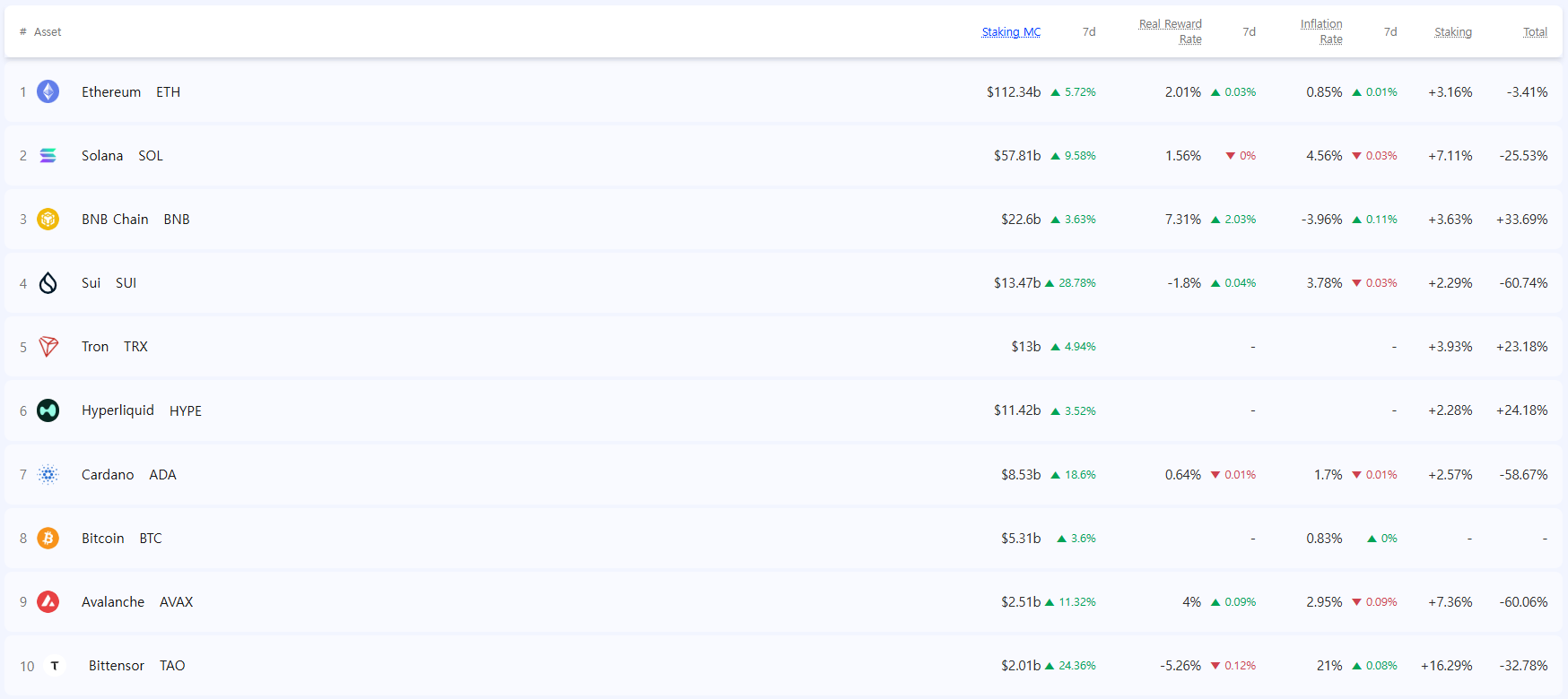 스테이킹 시가총액과 보상률 지표에서 체인별 온도 차가 뚜렷해지며, 자산별 참여 강도와 수익 구조의 차별화가 부각되고 있다.