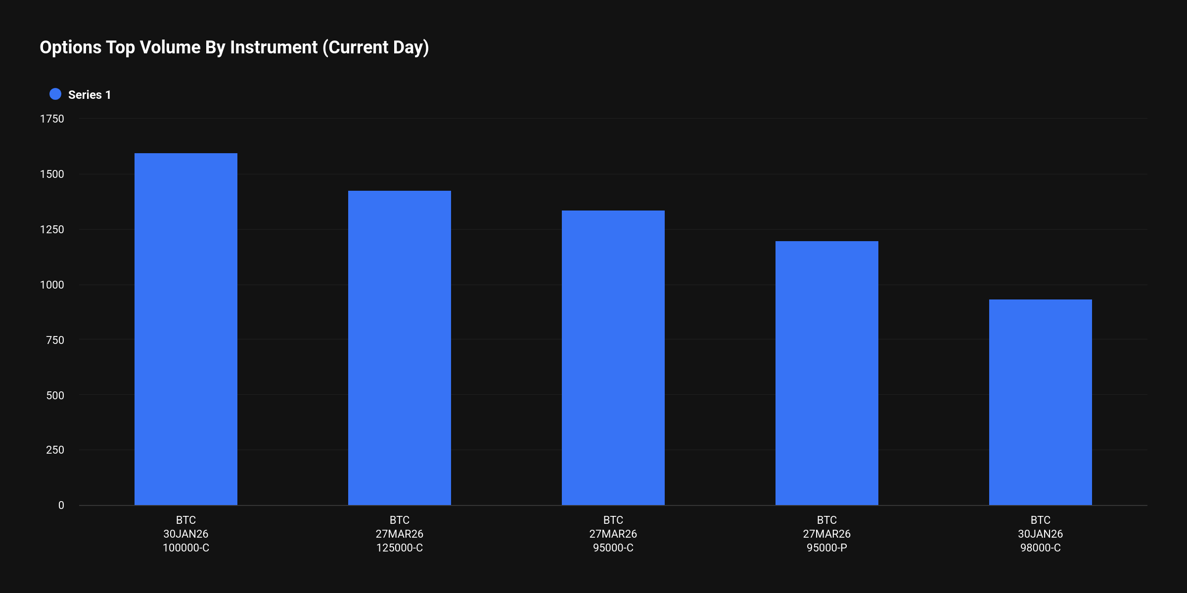 현재 옵션 시장에서는 콜옵션 거래가 압도적으로 우세한 가운데, 10만 달러 이상 상단 행사가에 거래량이 집중되는 쏠림 현상이 뚜렷하게 나타나고 있다. 특히 12만5000달러와 10만 달러 콜옵션에 거래가 집중되며, 중기적으로 강한 상방 시나리오를 염두에 둔 포지셔닝이 강화된 모습이다. 동시에 9만5000달러 구간에서는 콜옵션과 풋옵션 거래가 함께 상위권에 포착되며, 해당 가격대를 중심으로 한 중기 분기점 인식도 확인된다. 전반적으로 콜옵션 중심의 거래량 확대는 옵션 시장이 중기 변동성 확대를 전제로 상방 기대 심리를 우선적으로 반영하고 있음을 시사한다.
