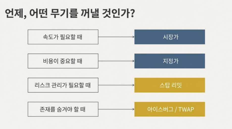 매수 버튼 하나에도 전략이 숨어 있다. 초보자는 가격만 보지만, 고수는 '어떻게(How)' 살지를 고민한다. 상황에 맞는 주문 방식을 골라 쓰는 것, 그것이 스마트한 트레이딩의 시작이다.