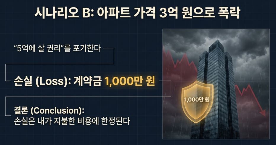 가격 폭락 시: 아파트값이 3억이 되었다. 당신은 5억에 살 권리를 포기한다. 1,000만 원(프리미엄)만 날리고 끝이다.