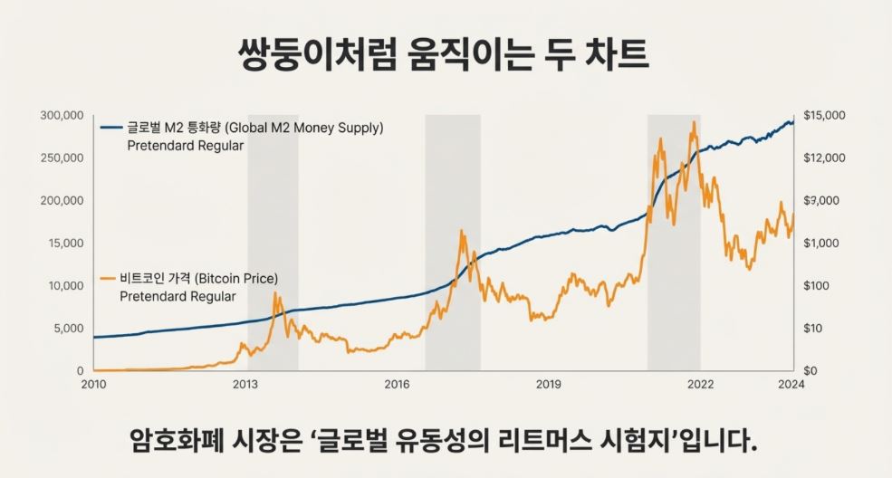 비트코인 가격 차트와 '글로벌 M2 통화량(시중에 풀린 돈)' 그래프를 겹쳐보면 놀라울 정도로 일치한다.