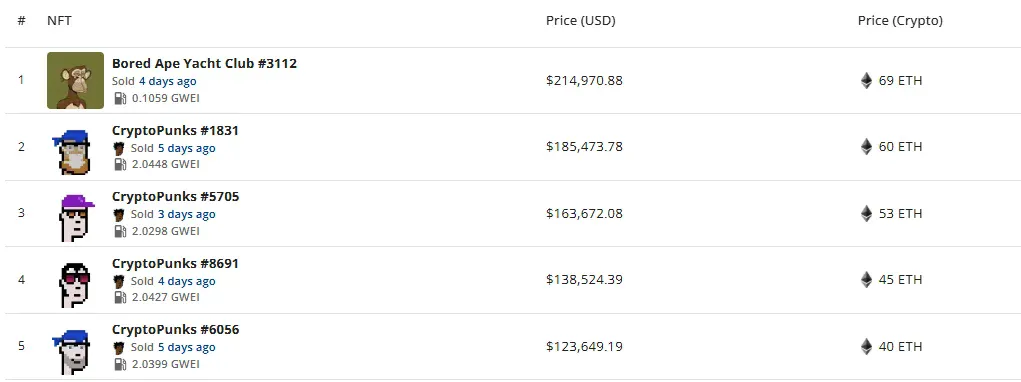 지난주 최고가에 거래된 NFT는 지루한원숭이요트클럽 #3112로, 21만4971달러(69 ETH)에 판매됐다.