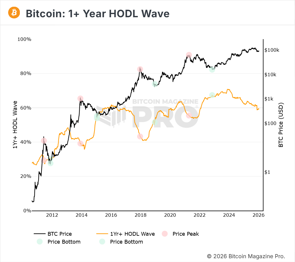 그럼에도 불구하고 59%대를 유지하고 있다는 점에서 장기 보유자의 공급 제한 효과는 여전히 유효한 상태다. 이는 단기 가격 변동 국면에서도 중·장기 보유 성향이 구조적으로 크게 훼손되지 않고 있음을 시사한다.