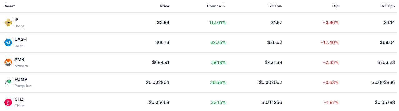 [편집자주] 급락 이후의 되돌림 흐름은 단기 매수세 유입 여부를 가늠하는 하나의 힌트가 될 수 있다. '저점(Dip)'은 최근 7일 최저가를, '반등(Bounce)'은 해당 저점 대비 상승률을 뜻한다. 이를 통해 기술적 반등 흐름과 시장의 수요 반응을 함께 살펴볼 수 있다. 조정 구간 이후 가격이 눈에 띄게 회복된 종목은 다음 추세 전환 가능성을 시사할 수도 있다. 반복적으로 나타나는 가격 패턴을 바탕으로 반등 흐름이 감지되는 자산을 소개한다.