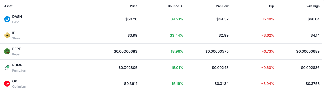 하루 동안 가장 큰 반등률을 기록한 자산은 대시(DASH)로, 일중 저점 44.52달러에서 34.21% 상승해 59.20달러까지 회복했다.