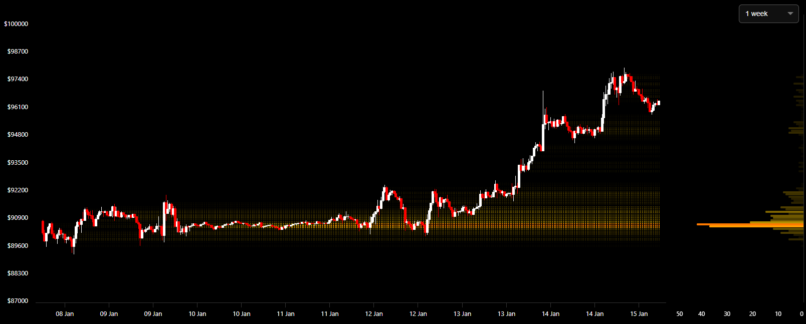 24시간 차트에서는 9만4500~9만5500달러 구간에 가장 두터운 거래량이 쌓여 있다. 해당 구간은 최근 가격이 반복적으로 머무른 단기 균형축으로, 하락 시마다 매수 유입이 확인되며 지지 역할을 수행해왔다. 실제로 이 구간 접근 시 하락 속도가 둔화되고 제한적인 반등이 동반됐다.