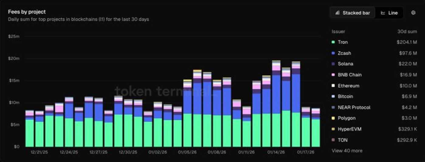 지난 4개월 전만 해도 트론(Tron)은 전체 L1 수수료의 약 75%를 독식하며 "다른 체인들이 개발(Build)할 때 트론은 수금(Collect)한다"는 평가를 받았다. 그러나 최신 데이터에 따르면 트론의 점유율은 56%로 조정되었고, 그 빈자리를 지캐시가 무서운 속도로 채웠다.