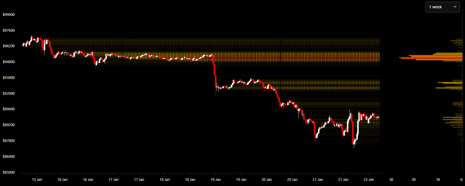 1주일 차트에서는 구조적 특징이 더욱 뚜렷하다. 상단에는 9만4000~9만6000달러 구간에 대규모 매도벽이 형성돼 있다. 해당 구간은 최근 급락이 시작된 가격대로, 단기 반등이 이어지더라도 본격적인 거래량 증가 없이는 재돌파 가능성이 제한적인 영역이다.