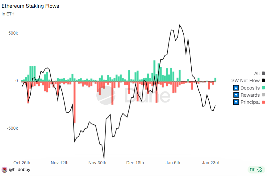 같은 기간 보상 출금은 총 1만6793 ETH, 원금 출금은 총 15만5571 ETH로 집계돼 출금 우위 흐름이 지속됐다. 원금 출금은 1월 22일 8만3168 ETH, 1월 24일 3만3760 ETH 등에 집중되는 양상이 두드러졌다.