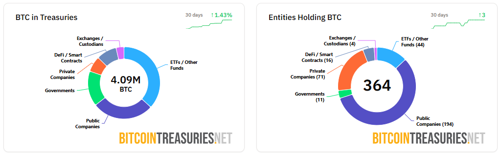 26일 비트코인트레저리 집계에 따르면 기관이 보유 중인 비트코인은 총 409만 BTC로, 최근 30일 기준 약 1.43% 증가한 것으로 나타났다. 같은 기간 비트코인을 보유한 기관 수는 3곳 늘어나 총 364곳으로 집계됐다.