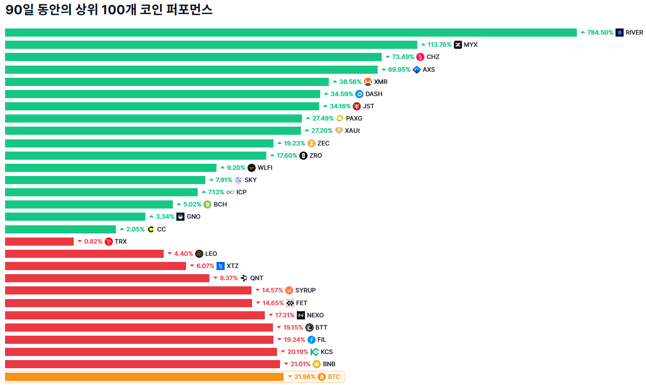 현재 지수는 28로 지난주(29), 전일(29) 대비 소폭 낮아졌다. 여전히 '비트코인 시즌(≤25)' 경계선에 위치하며 시장 자금의 중심이 비트코인에 쏠린 흐름이 이어지고 있음을 시사한다.