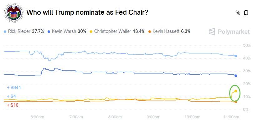 이번 회의에서 크리스토퍼 월러 이사가 금리 인하를 주장하는 선명한 비둘기파적 행보를 보이자, 예측 시장인 폴리마켓(Polymarket)에서는 그가 차기 연준 의장이 될 확률이 급상승했다.