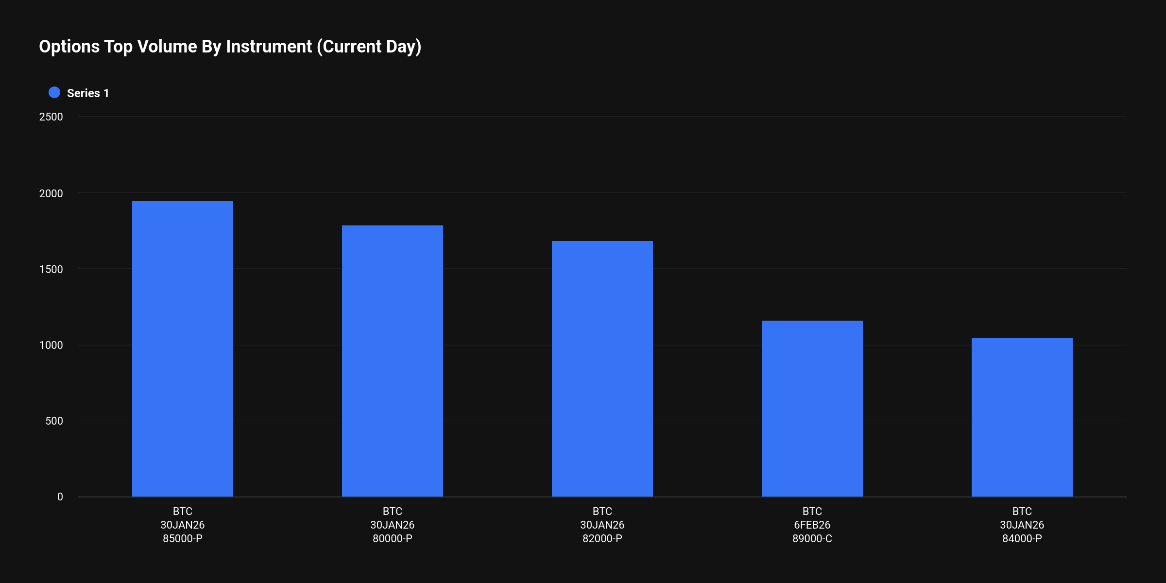 최근 24시간 동안 거래된 옵션 계약을 보면 풋옵션 거래량은 3만2627.50건, 콜옵션 거래량은 2만9901.80건으로 풋옵션이 우위를 보였다. 24시간 거래량 기준 풋/콜 비율은 1.09다.