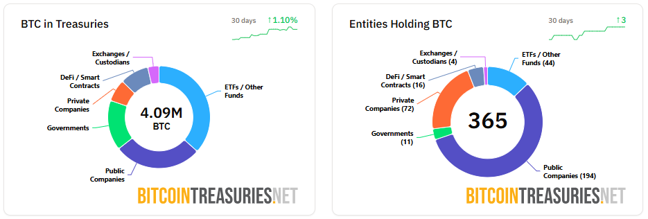 2일 비트코인트레저리 집계에 따르면 기관이 보유 중인 비트코인은 총 409만 BTC로, 최근 30일 기준 약 1.10% 증가한 것으로 나타났다. 같은 기간 비트코인을 보유한 기관 수는 3곳 늘어나 총 365곳으로 집계됐다.