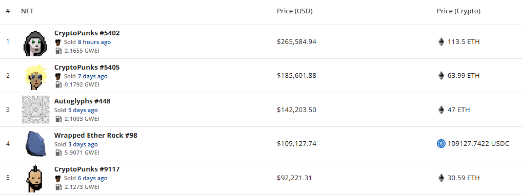 지난주 최고가에 거래된 NFT는 크립토펑크 #5402로, 26만5584달러(113.5 ETH)에 판매됐다.