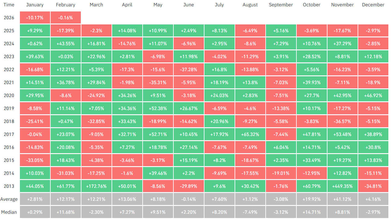 이달 현재까지 비트코인은 -0.16%의 월간 수익률을 기록 중이다. 2월 평균 수익률은 12.17%, 중앙값은 11.68%로, 13번 중 10번 상승 마감했다.