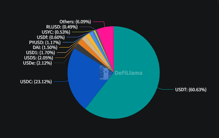 스테이블코인 시장 점유율을 보면 1위 테더(USDT)가 1850억3000만 달러(60.63%)로 전체 시장의 절대적 우위를 유지하고 있으며 2위 USD코인(USDC)은 705억4800만 달러(23.12%)로 뒤를 이었다.