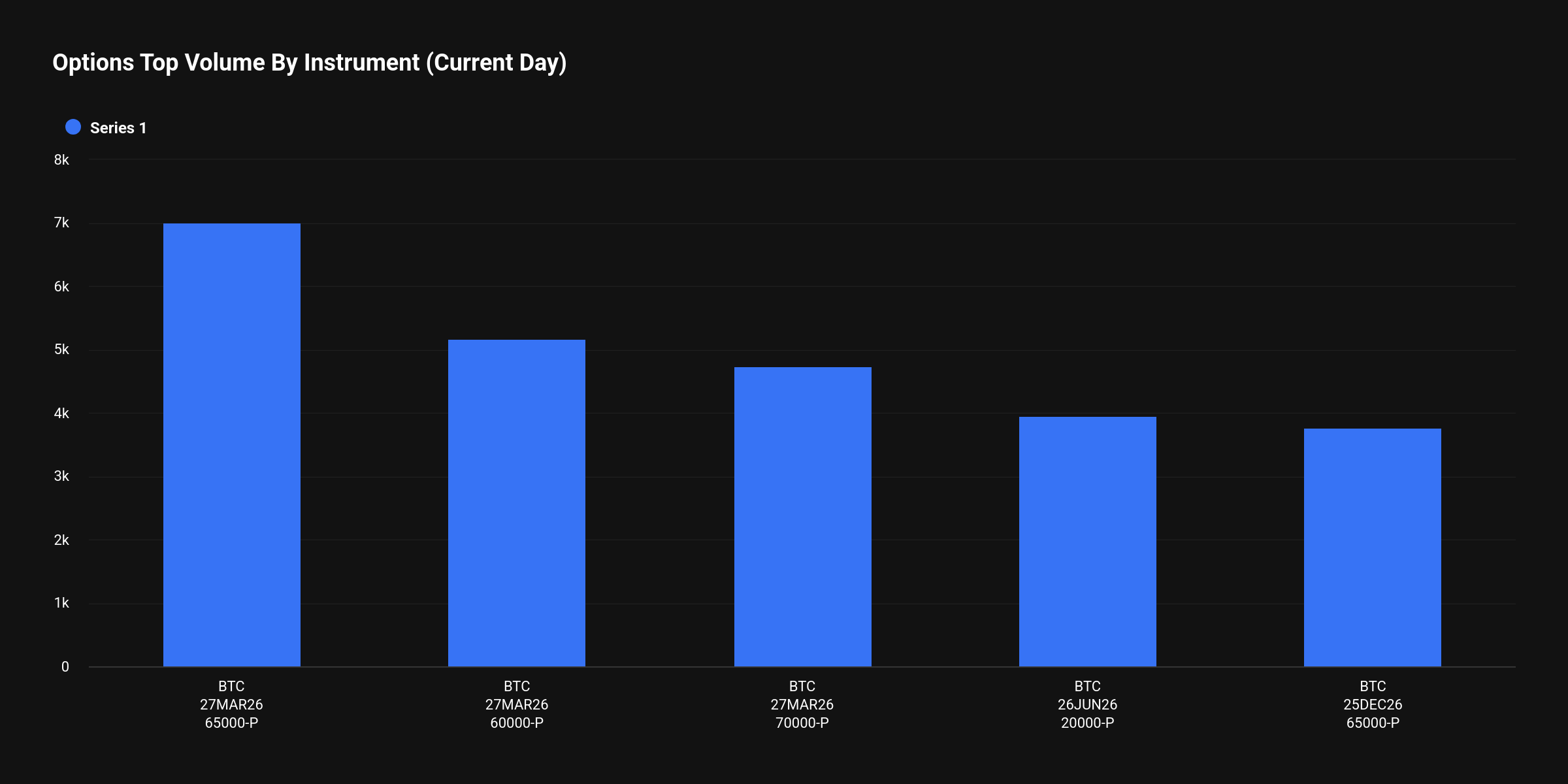 풋옵션 거래가 상위권을 대부분 차지하며 6만~7만 달러 구간에 거래량이 집중되고 있다. 특히 3월 27일 만기 풋옵션들이 다수 포진해 중기 조정 가능성에 대비한 하방 헤지 수요가 두드러진다. 동시에 6월·12월 만기 저가 풋옵션도 포함되며, 옵션 시장은 단기 변동성뿐 아니라 중장기 하락 리스크까지 염두에 둔 방어적 포지셔닝을 이어가고 있음을 시사한다.