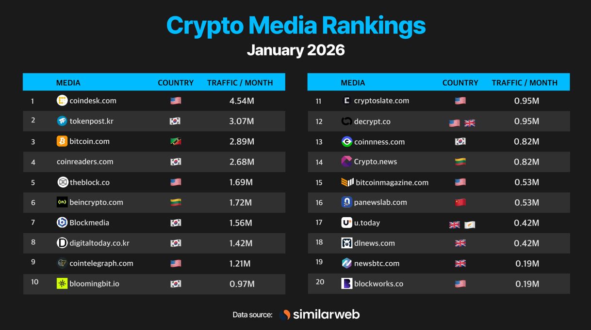 글로벌 디지털 인텔리전스 플랫폼 시밀러웹(Similarweb)의 2026년 1월 데이터에 따르면, 토큰포스트는 약 307만 명의 월간 방문자 수를 기록하며 전 세계 크립토 미디어 중 2위를 차지했다.