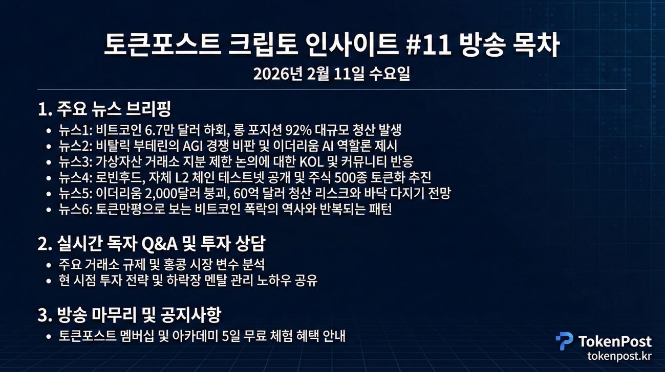 2월 11일 수요일, 암호화폐 시장이 매서운 하락세를 맞이했다. 비트코인(BTC)은 주요 지지선인 6만 7천 달러선을 내주었고, 이더리움(ETH) 역시 2천 달러 아래로 주저앉았다. 시장은 투기적 열기가 식고 극도의 관망세로 돌아선 모습이다.