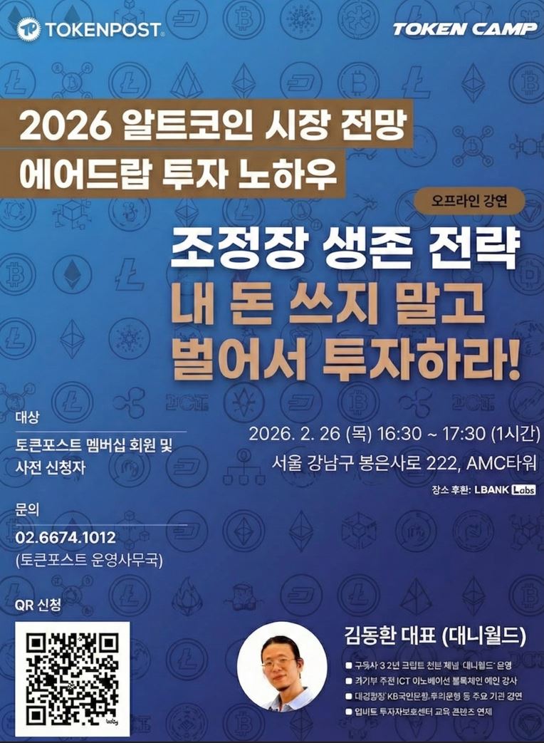 이번 캠프는 크립토 베스트셀러 저자이자 ICT 혁신 블록체인 메인 강사로 활동 중인 김동환 대표가 연사로 나서 <2026 알트코인 시장 전망 및 에어드랍 투자 노하우>를 주제로 강연한다.