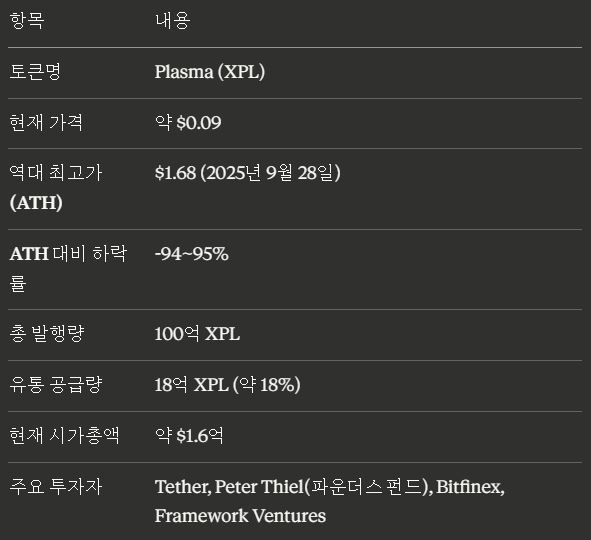 2025년 하반기 크립토 시장에서 가장 뜨거웠던 프로젝트 중 하나인 플라즈마(Plasma)가 상장 이후 불과 4개월여 만에 역대 최고가 대비 약 94~95% 하락했다. 현재 XPL 가격은 약 $0.09 수준으로, 역대 최고가인 $1.68 대비 -94.45%를 기록하고 있다.