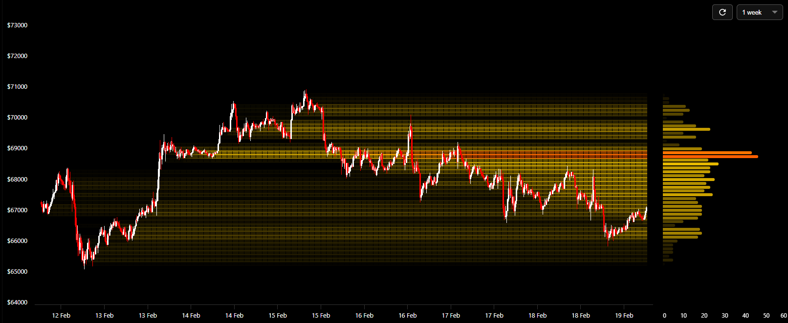 2월 12일부터 19일까지 1주일 흐름을 보면 가격은 7만1000달러 부근 고점을 형성한 이후 점차 낮은 고점을 만들며 하락 구조를 강화했다. 특히 6만9000~7만1000달러 구간에는 두터운 거래 밀집대가 형성돼 있다. 이 구간은 과거 지지 역할을 했으나 현재는 명확한 저항대로 전환된 모습이다. 반등 시도는 이어지고 있으나 7만달러 상단에 접근할 때마다 매도 물량이 출회되며 상승이 제한되고 있다.