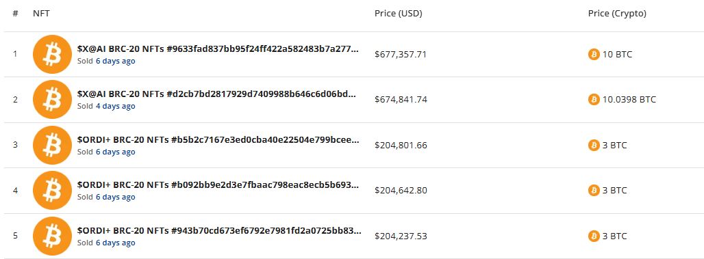 지난주 최고가에 거래된 NFT는 $X@AI BRC-20 NFTs #9633fa...aedai0로, 67만7357달러(10 BTC)에 판매됐다.