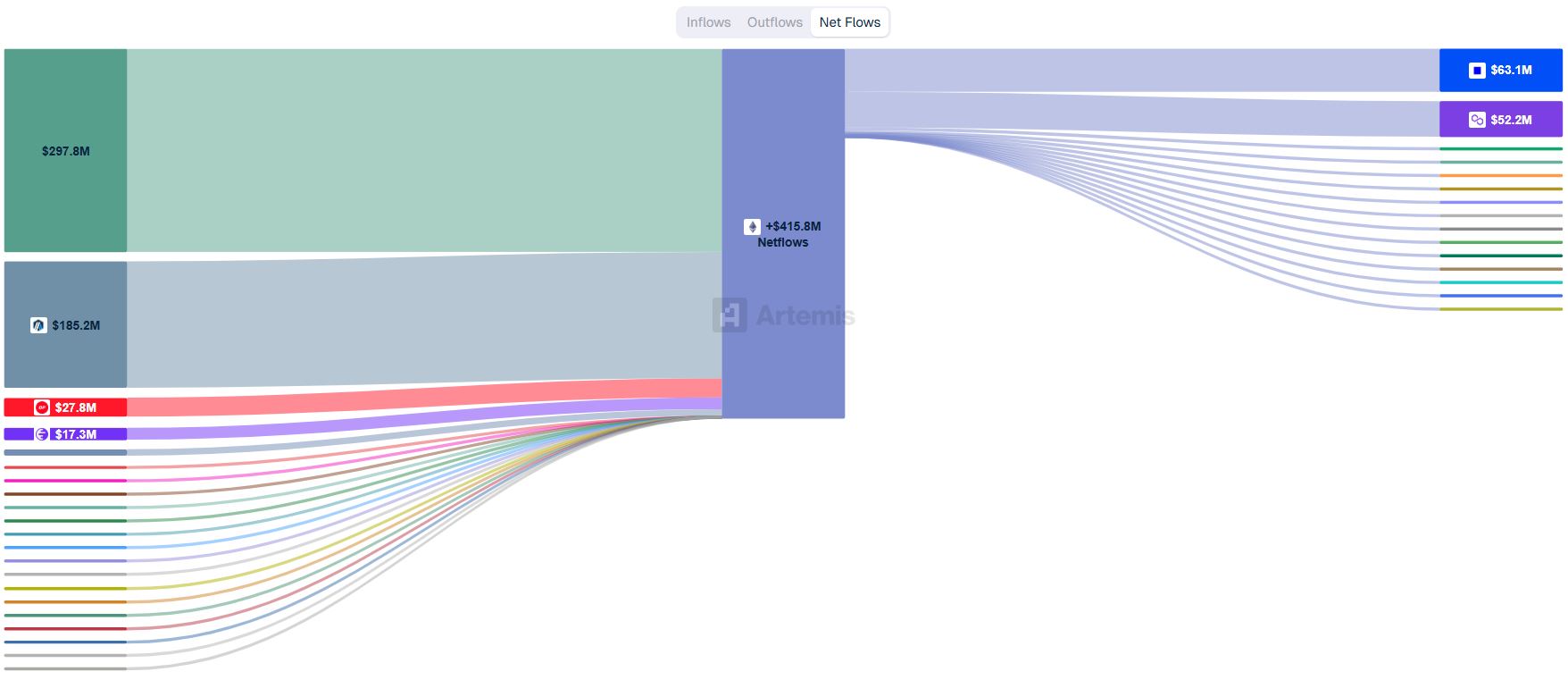 25일 기준 암호화폐 분석 플랫폼 아르테미스에 따르면 최근 7일간 가장 많은 브리지 자산 유입을 기록한 체인은 이더리움으로, 총 5억1165만 달러가 유입됐다.