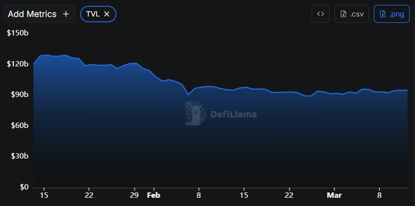 디파이라마에 따르면 3월 13일 기준 디파이 TVL은 950억1500만 달러를 기록했다. 단기적으로는 950억 달러 안팎에서 완만한 등락 흐름을 이어가는 모습이다.