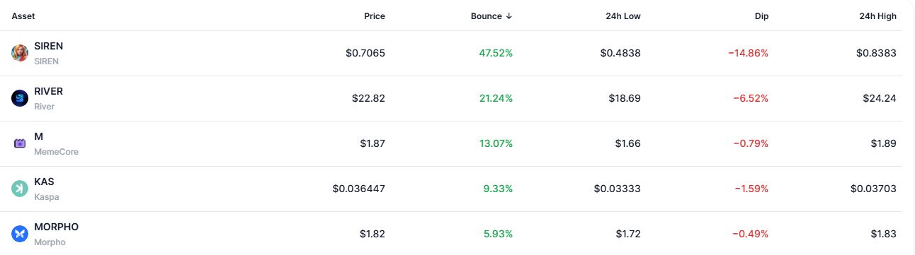 하루 동안 가장 큰 반등률을 기록한 자산은 사이렌(SIREN)으로, 일중 저점 0.4838달러에서 약 48% 상승해 0.7065달러까지 회복했다.
