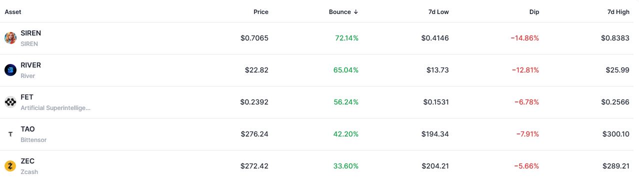 [편집자주] 급락 이후의 되돌림 흐름은 단기 매수세 유입 여부를 가늠하는 하나의 힌트가 될 수 있다. '저점(Dip)'은 최근 7일 최저가를, '반등(Bounce)'은 해당 저점 대비 상승률을 뜻한다. 이를 통해 기술적 반등 흐름과 시장의 수요 반응을 함께 살펴볼 수 있다. 조정 구간 이후 가격이 눈에 띄게 회복된 종목은 다음 추세 전환 가능성을 시사할 수도 있다. 반복적으로 나타나는 가격 패턴을 바탕으로 반등 흐름이 감지되는 자산을 소개한다.