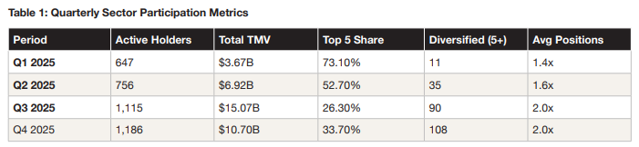 성장 과정에서 시장 구조도 변화했다. 상위 5개 투자자 비중은 1분기 73.1%에서 3분기 26.3%까지 낮아지며 분산 구조로 이동한 뒤 4분기 33.7%로 다시 상승했다. 이는 초기 소수 집중 구조에서 기관 확산이 진행된 후 다시 핵심 자본 중심으로 재편되는 흐름을 보여준다. 동시에 기관 평균 투자 종목 수는 1.4개에서 2.0개로 증가하며 포트폴리오가 확대됐다. 특히 5개 이상 종목에 투자하는 기관 수는 11개에서 108개로 882% 증가하며 DAT가 하나의 섹터로 인식되기 시작했음을 시사한다.