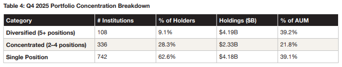 포트폴리오 구조에서는 ‘수적 다수와 자금 영향력의 괴리’가 뚜렷하게 나타났다. 단일 종목 투자 기관은 742개로 전체의 62.6%를 차지했지만 자산 비중은 39.1%에 그쳤다. 반면 5개 이상 종목에 투자한 기관은 108개로 9.1%에 불과했지만 41억9000만 달러를 보유하며 전체 자산의 39.2%를 차지했다. 2~4개 종목 투자 기관은 336개로 28.3%, 자산 23억3000만 달러를 기록했다. 이는 소수 대형 기관이 분산 투자를 통해 시장을 주도하는 구조가 형성됐음을 의미한다.